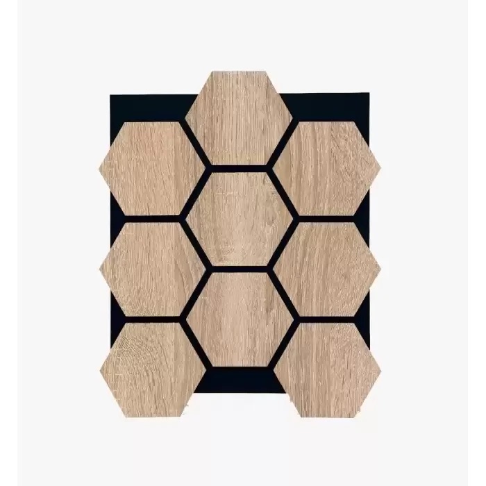 Decorative hexagon acoustic wall panel made from MDF wood tiles on a black felt backing, designed to improve sound comfort while adding a modern geometric look to residential and commercial interiors.